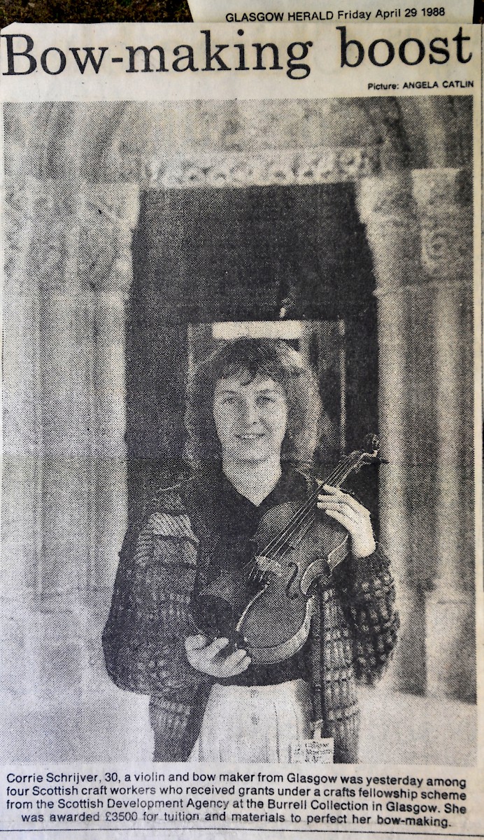 Since graduating, Cornelia has worked at various workshops, notably spending 17 years in the Glasgow area, making and restoring for string players in the Royal Scottish National Orchestra and the BBC Scottish Symphony Orchestra as well as maintaining the collection of instruments and bows belonging to the Royal Conservatoire of Scotland (formerly Royal Scottish Academy of Music and Drama). Many of Scotland’s traditional musicians also found their way to her workshop. Amongst them the talented pioneering tutors at the Glasgow Fiddle Workshop, and Shetland fiddler Willie Hunter who used to send his bows down to be repaired, rehaired and posted back to Lerwick Laundry.