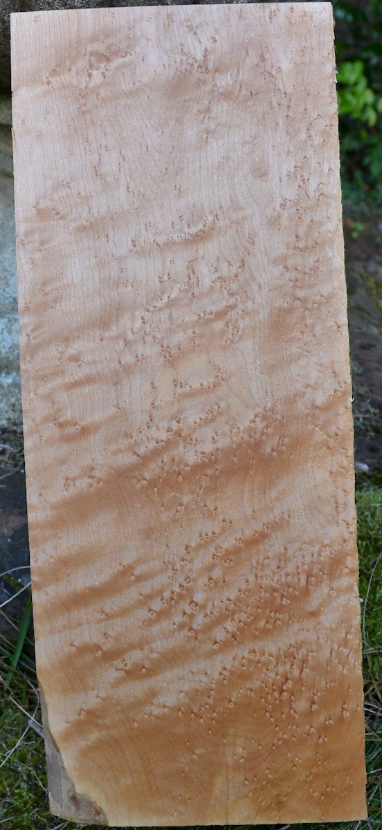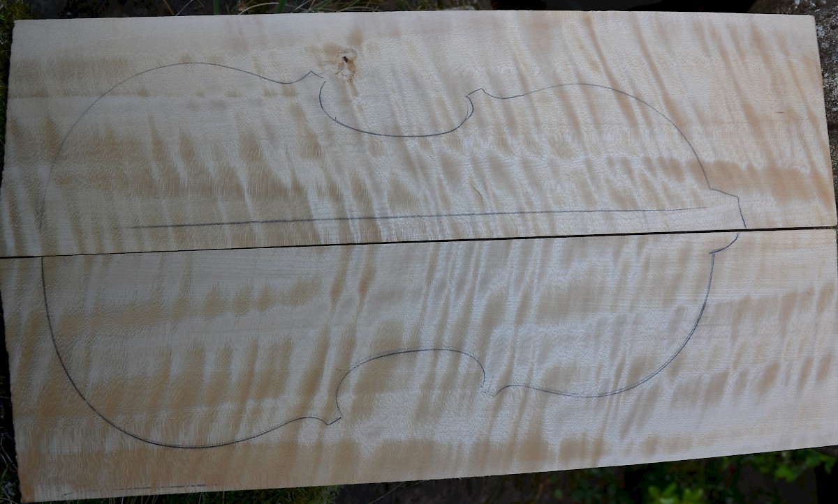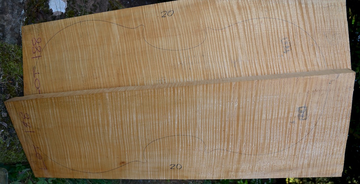 Maple, more specifically, Acer Pseudoplatanus; or Sycamore, Is the wood of choice for violin backs, ribs and scroll. It has a good strength / weight ratio, and as a bonus, comes in a variety of pleasing patterns. The “Flame” which runs across the direction of the grain, is caused by the tree fibres growing in a wavy pattern. Highly flamed wood looks more attractive, is more expensive, is more difficult to come by and is more difficult to work with because of the variable grain direction. It can also be stronger. The curly fibres act as a rip stop. Sycamore which grows in mountainous or colder regions usually has the growth lines closer together. This makes for denser, stronger wood which can be made into thinner, more responsive, backs and ribs.