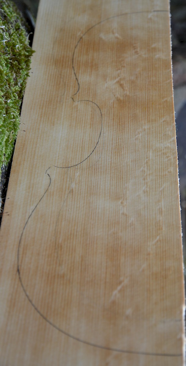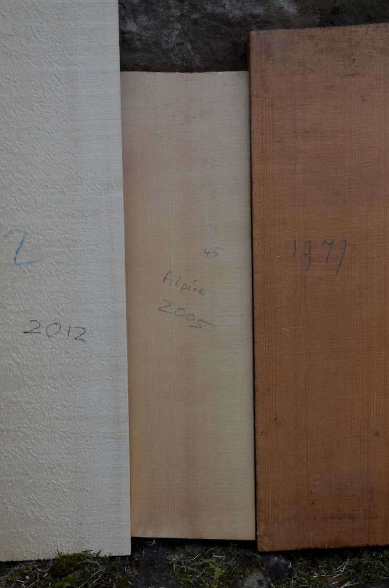 A ‘Cello Back, one piece violin back, and several other sections to be converted into Violin/Viola Backs. All from the same Sycamore tree I found in 1984, already cut down, in a park less than a mile away from my home in Scotland. A couple of meetings and 'phone calls later and I had two 40” tall lengths of tree trunk with a diameter of 26” delivered to the door. I have so far made a ‘Cello and a Lira da Braccio from this treeThe front of a violin is usually made of Pine. Sitka spruce, (Canadian), Picea Abies (Norway spruce) and Picea Glauca being some of the favourites
