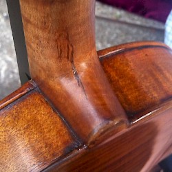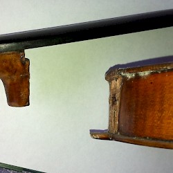 This very old violin came in with the pegbox shattered in several places and with the previous neckgraft dislodged. The neck and button had broken away from the body. The original button which sported a crown had disintegrated, some purfling was missing. After replacing the neck graft, I bushed all the peg holes and put a shim on both sides of the peg box.