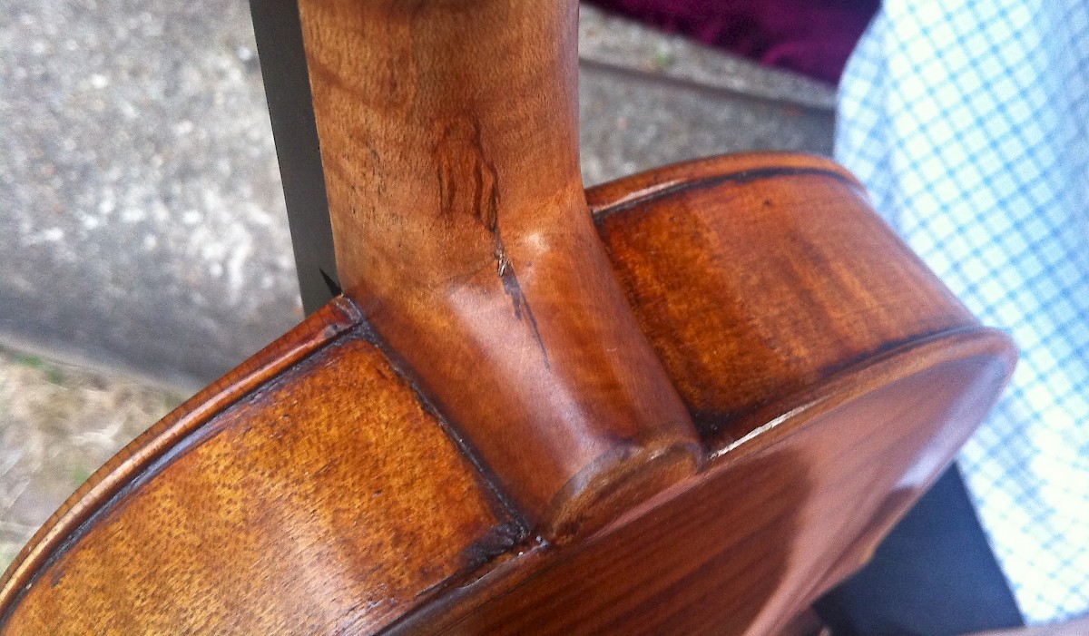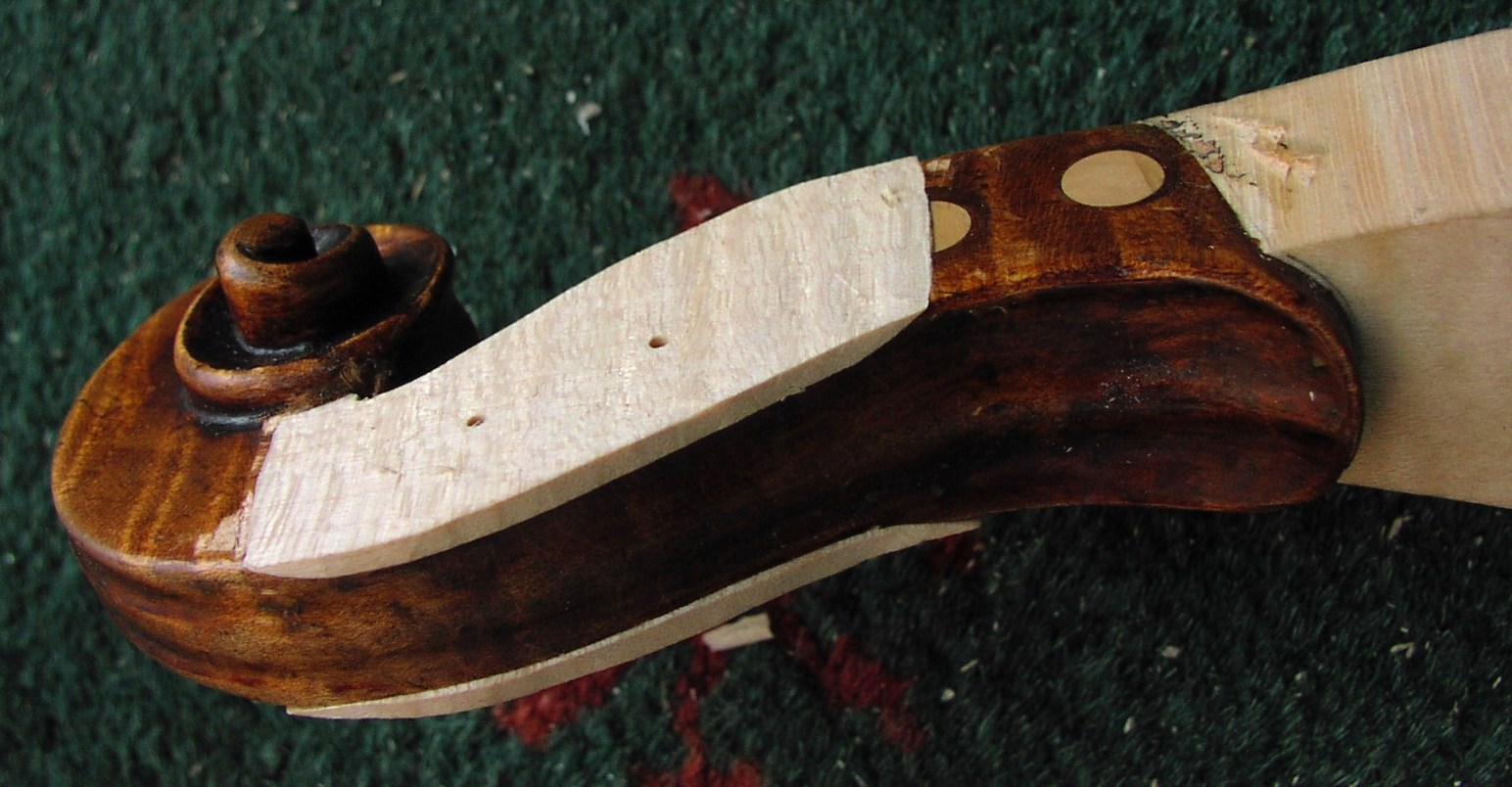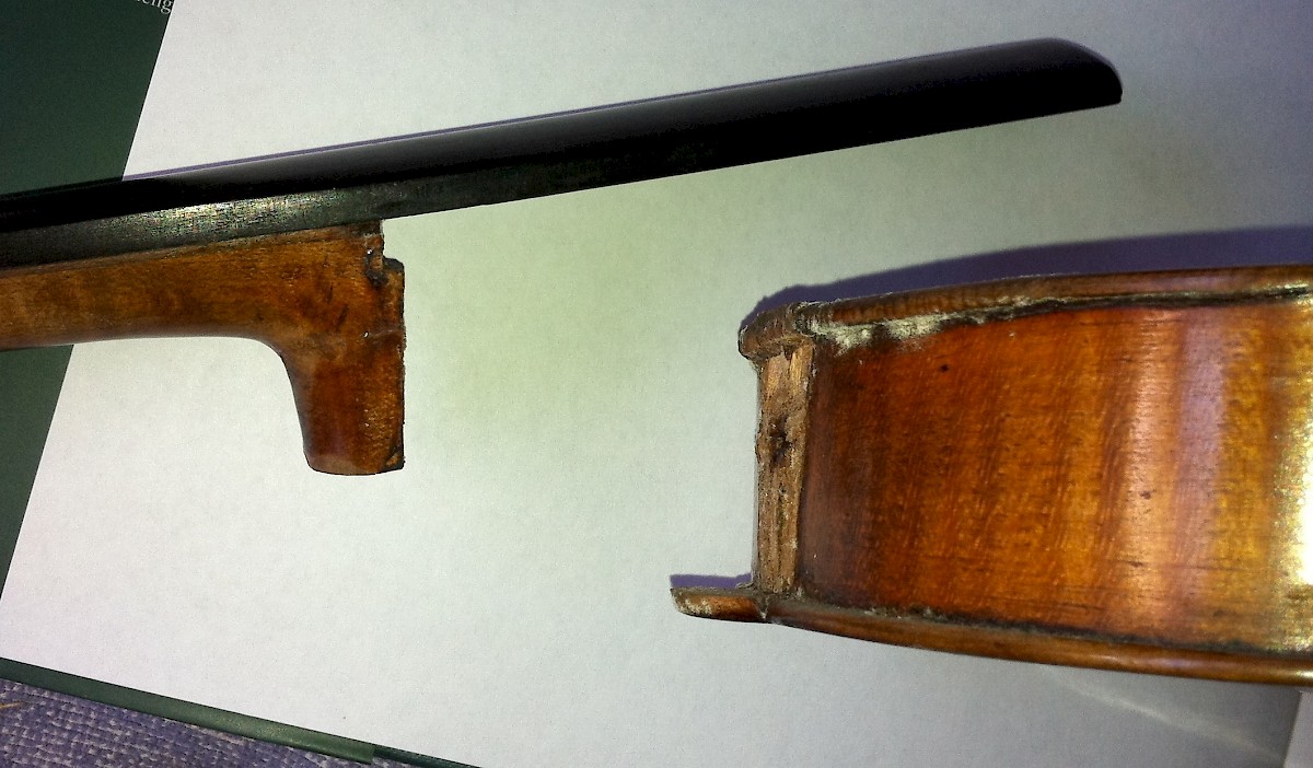 The neck of this old English violin of the classic period was originally butt jointed against the continuous top rib. Originally, a single nail was hammered in through the top block from the inside to keep the neck in place.