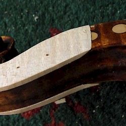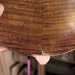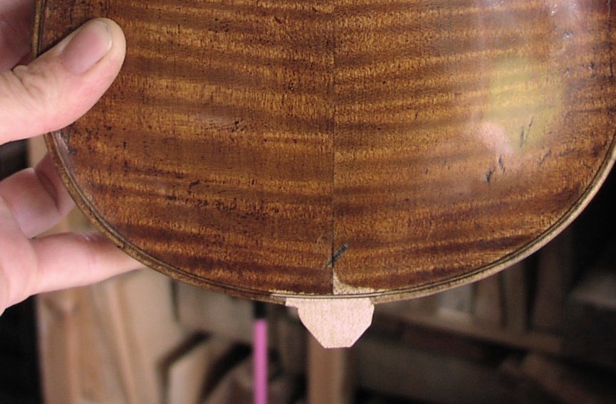 I fitted a new button, which extends underneath the centre joint of the back for strength, and a new piece of purfling to match the existing purfling.